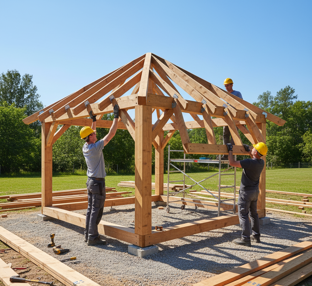 2️⃣ Сборка каркаса — монтаж пола, стен и опор из бруса, от качества зависит долговечность всей конструкции.