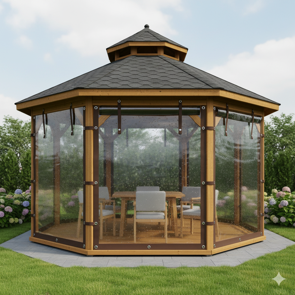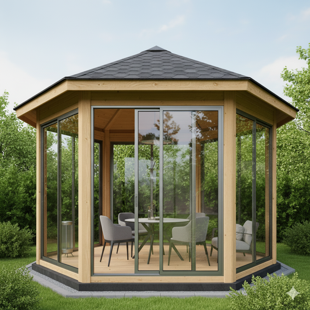 📌 3. Теплое остекление (ПВХ- или теплый алюминиевый профиль) ➡️ Минимум: Профиль ПВХ (аналогичный оконному) с двухкамерным стеклопакетом. 🔥 Подходит для: Превращения беседки в полноценную комнату, зимний сад или столовую с возможностью отопления до комфортных температур.